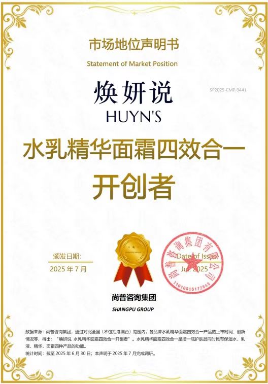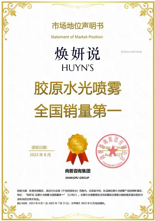 2025年,尚普咨询集团为焕妍说颁发市场地位声明书。此次焕妍说荣获尚普咨询【焕妍说 胶原水光喷雾全国销量第一】【焕妍说 全国透皮胶原水光领导品牌】【焕妍说 水乳精华面霜四效合一开创者】市场地位声明,标志着焕妍说在透皮胶原水光和水乳精华面霜四效合一细分领域中的领导地位及市场的高度认可。