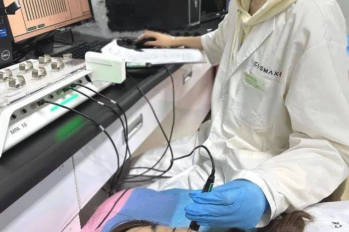 而在COSMAX产品功效评价中,针对保湿功效,检测团队严格参照QB/T 4256-2011 《化妆品保湿功效评价指南》中的标准进行测试,筛选24 名年龄18-60 周岁符合受试条件的亚洲成年受试者单次使用测试样品,使用皮肤水分测定仪Corneometer CM825在恒温恒湿的标准实验环境下进行测量。当产品使用前及产品使用后各规定时间点的角质层水分含量呈显著性差异,COSMAX功效评价团队才能认定该受试样品具有保湿效果。