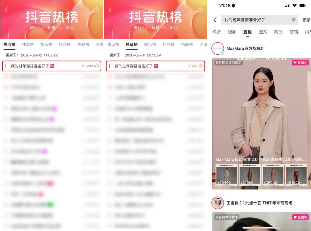 直播之外,抖音商城超级品牌日还通过多触点资源联动,为品牌构建了更立体的曝光结构,使节点声量在公域与商城场域内形成持续扩散。期间,#我的过年穿搭准备好了 登上抖音总榜、种草榜双榜 TOP1。利用话题热点,间接引导用户点击话题,热度峰值时,让话题页与品牌店铺页实现跳转直连,通过该链路缩短从种草到购买的操作成本,真正实现“热点即入口”的短链转化,将话题热度转化为品牌销量。