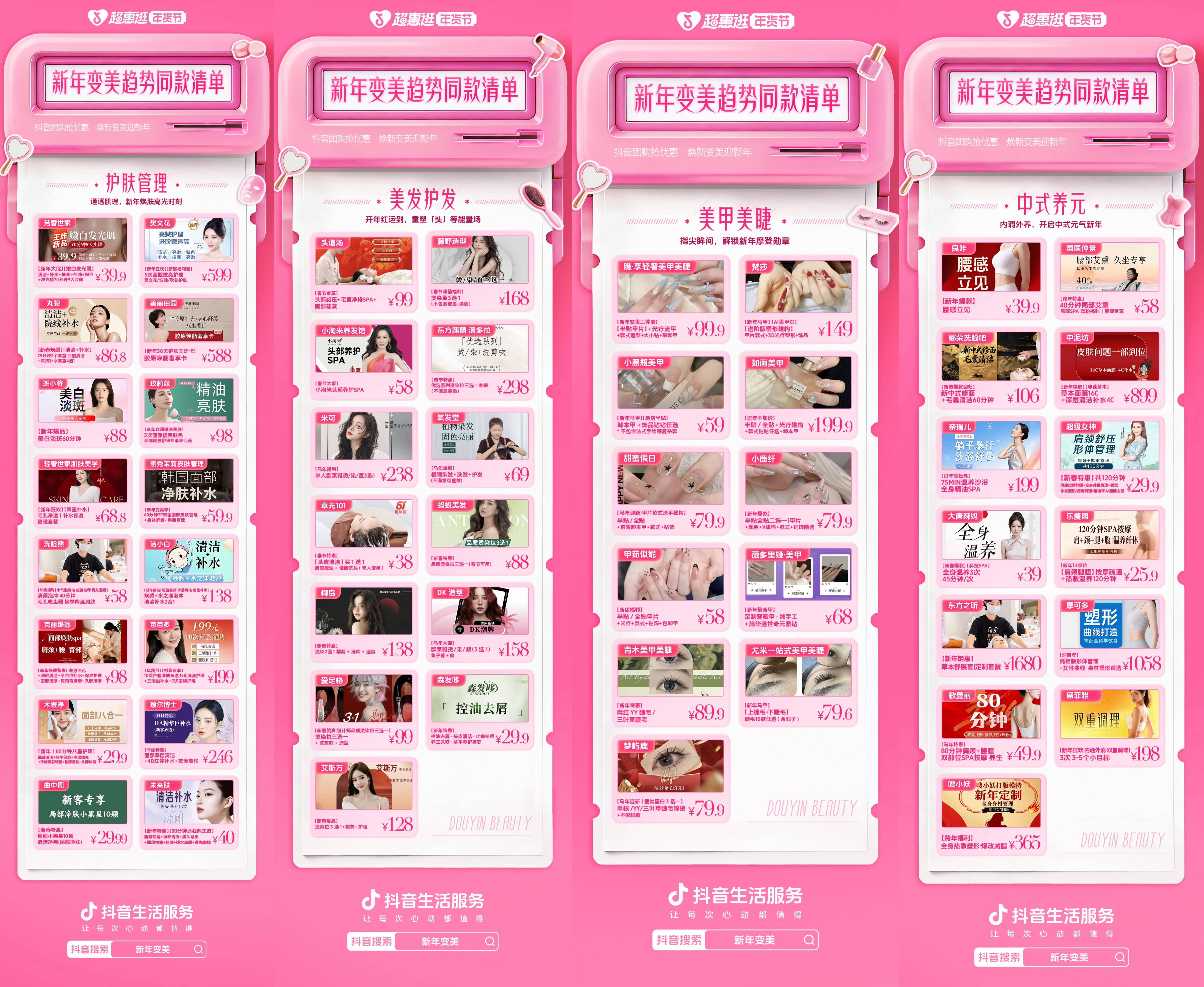 读懂“选择困难症”的抖音生活服务,还推出“新年变美三件套”创意商品组合,它洞察了用户在“变美”和“效率”之间的纠结,如同一位“变美搭子”,将美甲、美睫、局部塑形,集成在一份低至88.7元的变美提案中。“变美”这个复杂的系统工程,变为一次从容的悦己选择。